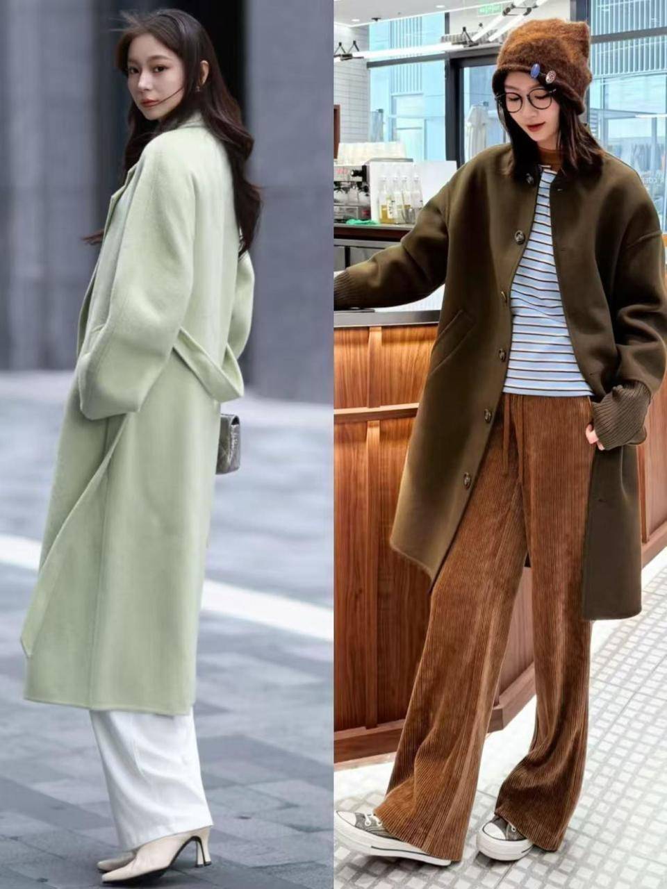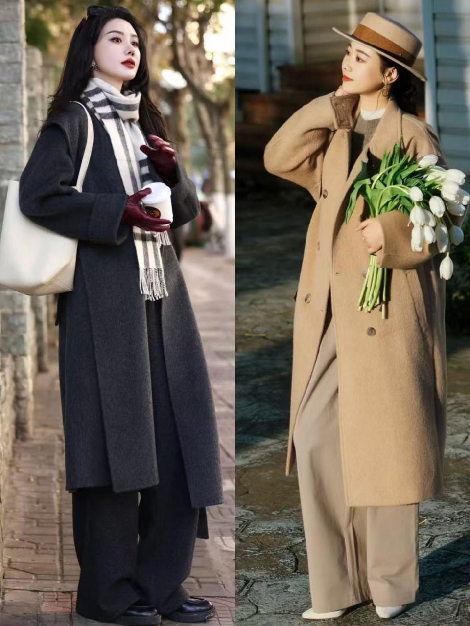 你的工作岗位每天需要跑上跑下走的路比较多,这时候如果穿比较硬的皮鞋肯定不适合我们,应该像上面左边的这位时尚达人一样,用一双老爹鞋搭配上白色的阔腿长裤,加上大翻领的大衣外套,这样的穿搭fashion同时又舒适。
