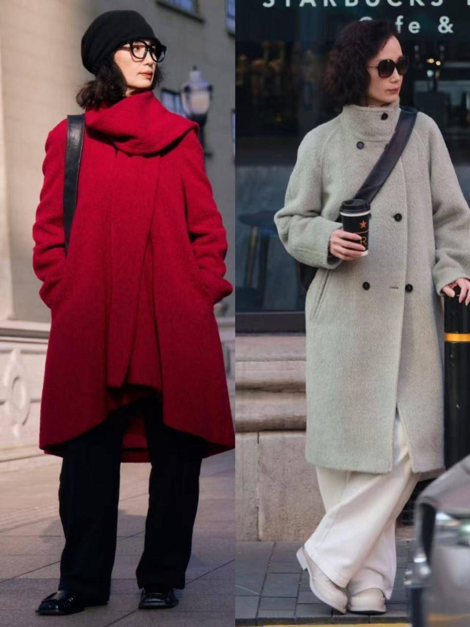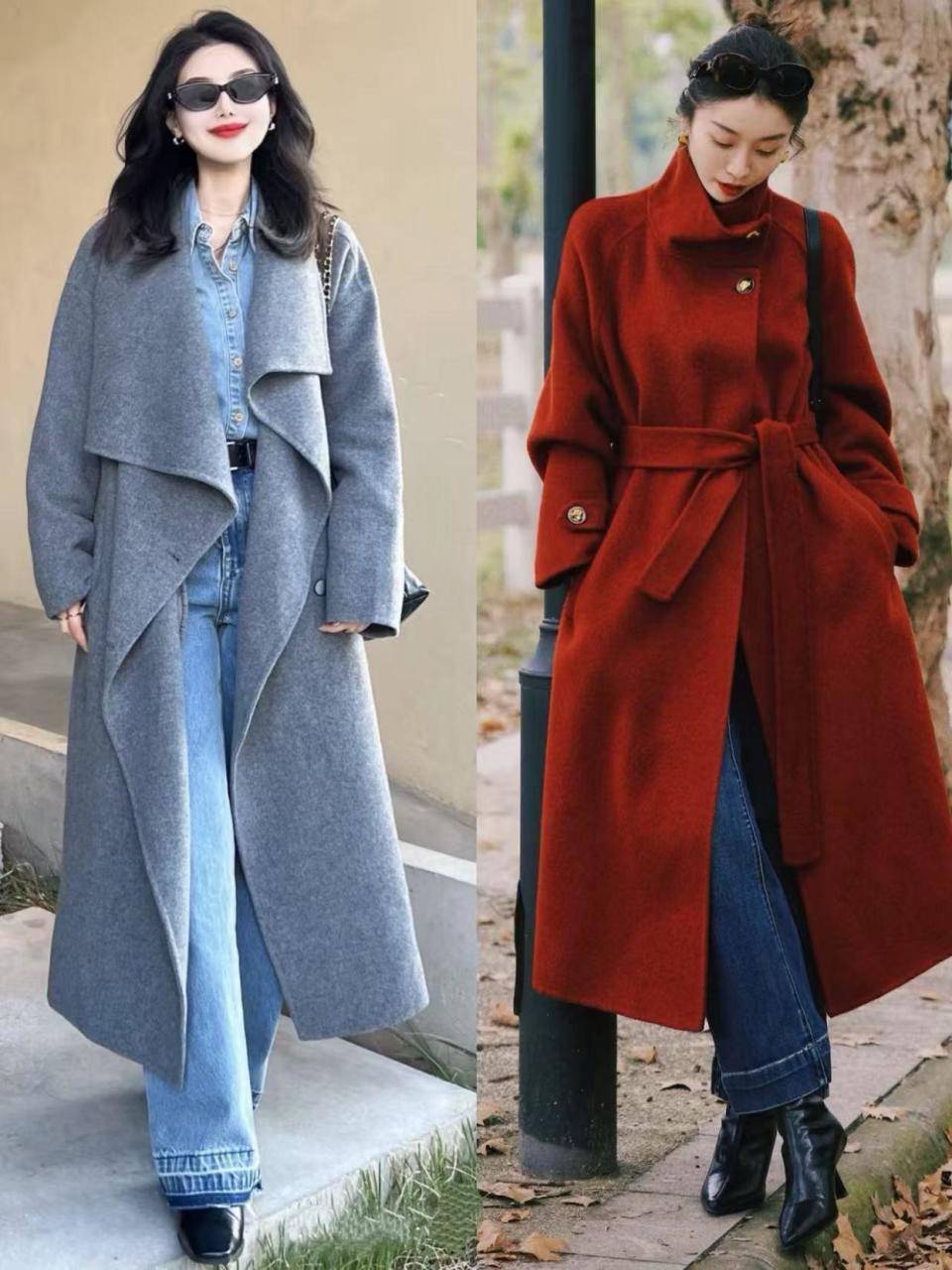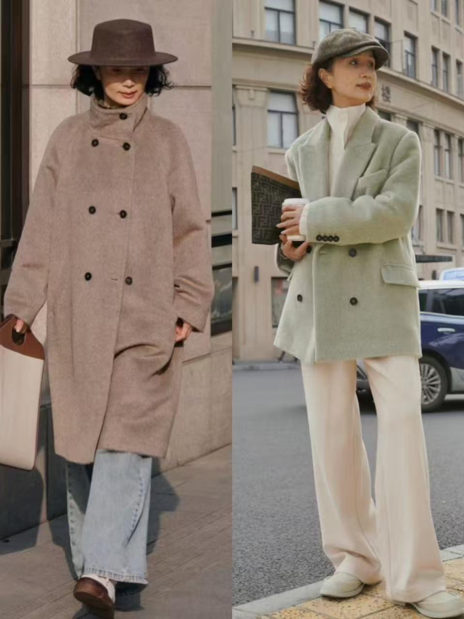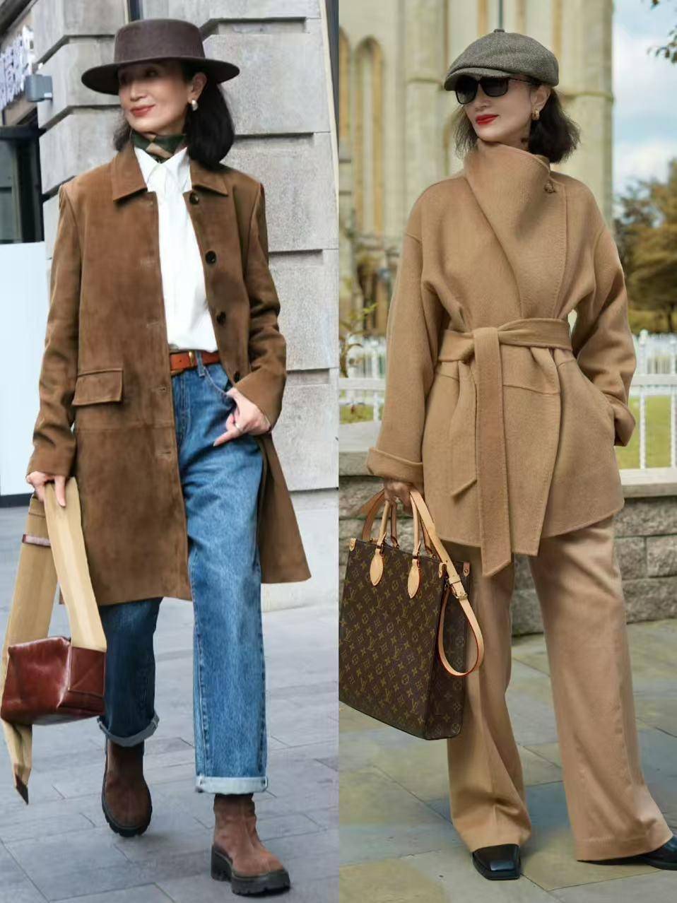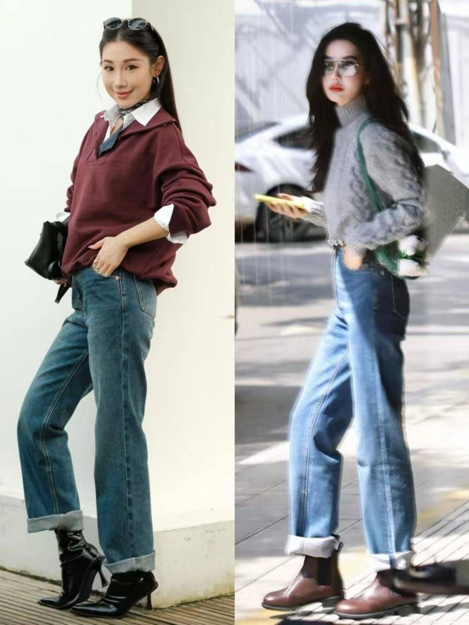 有的时候其实我个人更推荐你选择带点跟的短靴穿会更容易延伸腿部线条,咱们就看上面这两位素人的穿搭对比,红色的高跟短靴和牛仔裤,加上驼色大衣外套,就能使得身材形成三七分比例。