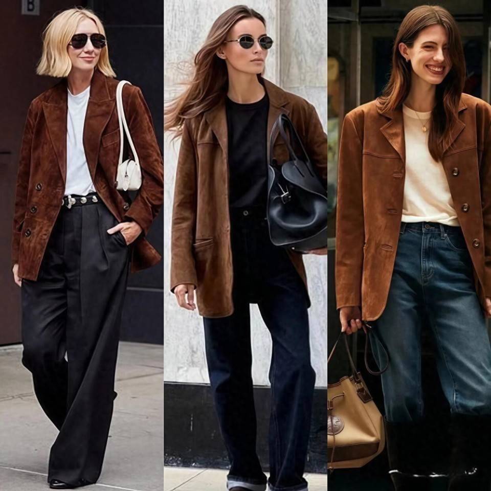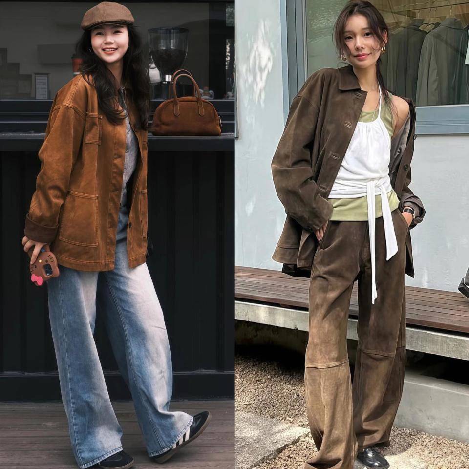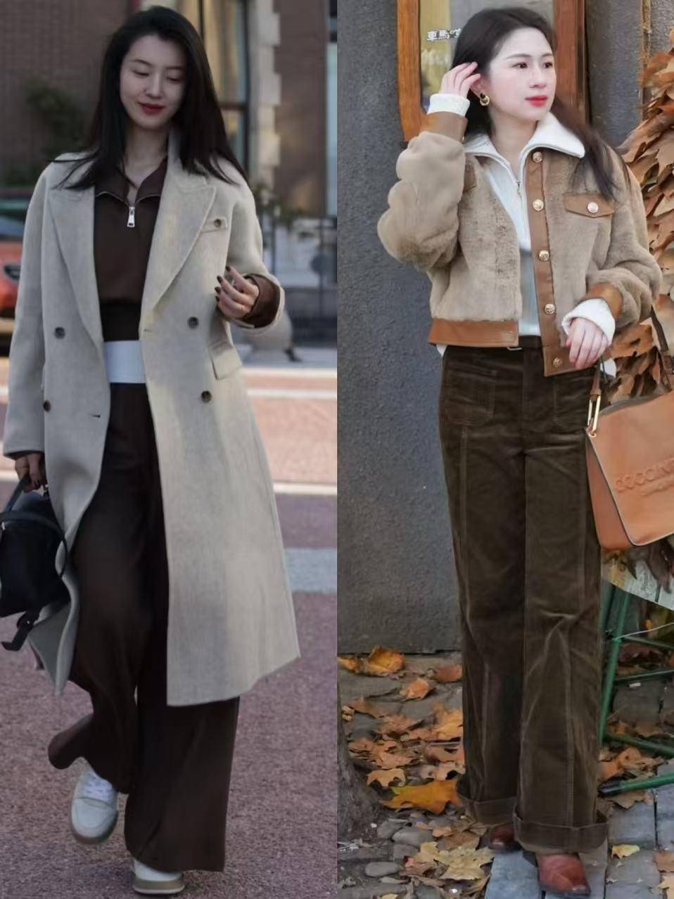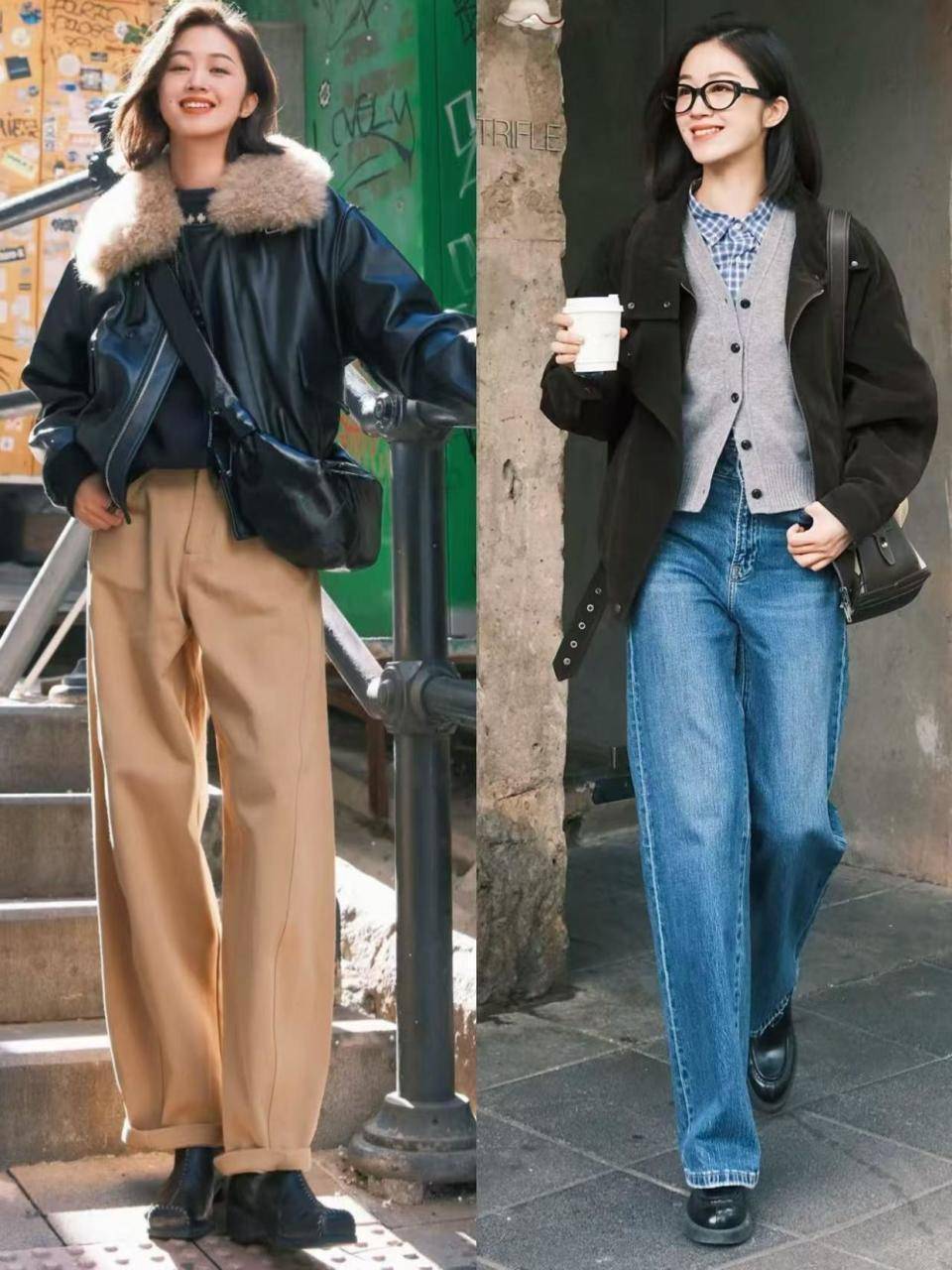 咱们就看上面左边的这1套穿搭,用黑色皮衣搭配卡其色的直筒阔腿裤,就要穿黑色的短靴,鞋子的颜色和皮衣外套是同色系,形成首尾呼应的效果,让整个造型颜色更协调,不会头重脚轻。