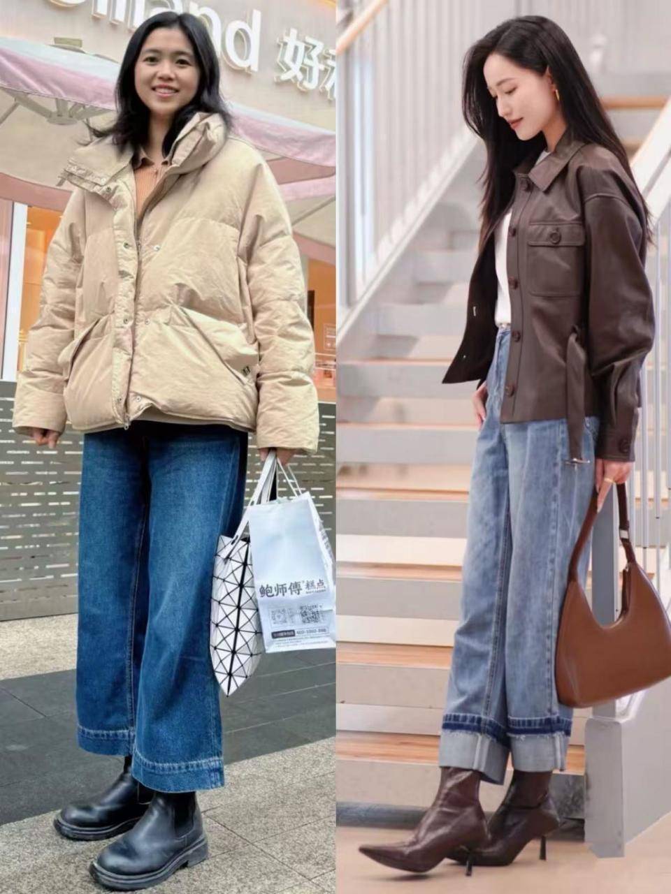 黑色的低跟短靴,搭配牛仔阔腿裤和羽绒服外套,少了一种品质感和精致感。