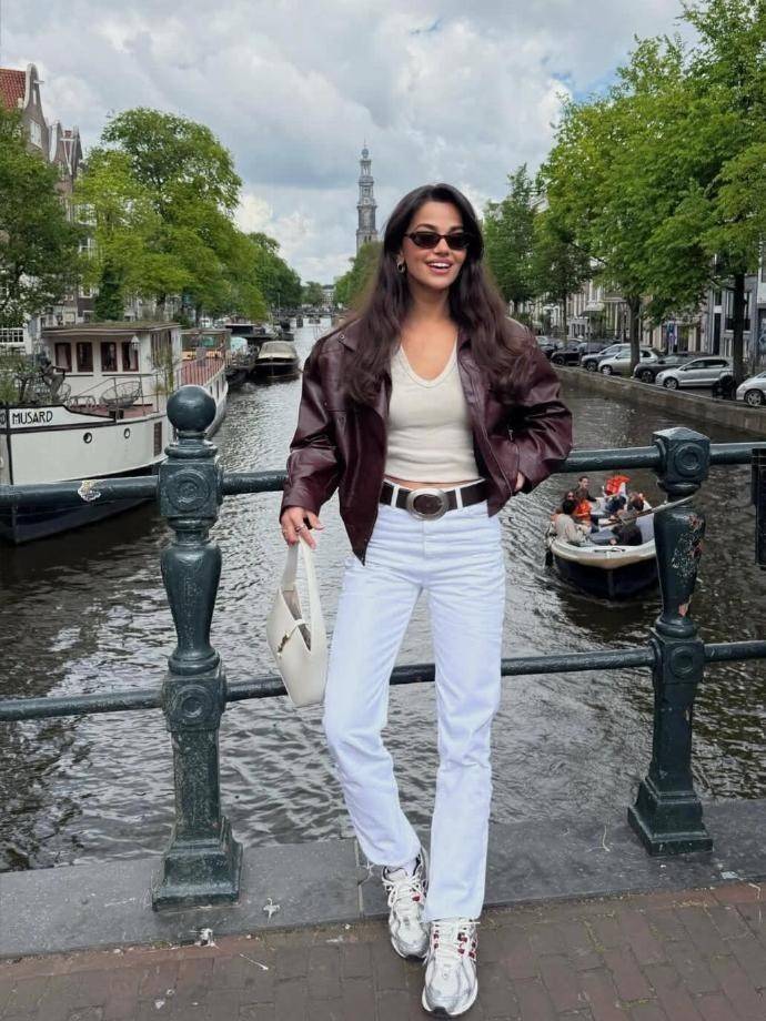 除了搭配逻辑清晰,色彩运用更是selinyagcioglu穿搭的加分项,也是她造型极具记忆点的关键。她从不会盲目堆砌色彩,而是精准把控“和谐与亮点”的尺度,既能用同色系搭配营造高级质感,也能轻松驾驭低饱和度撞色。日常穿搭中,她常以黑白灰、卡其等基础色系为底色,再用小面积亮色单品做点缀,比如米白色针织套装搭配红色腋下包,或是蓝色条纹衬衫搭配卡其色半裙,色彩过渡自然又能瞬间抓住眼球。这种色彩搭配思路灵活又好驾驭,不管是冷白皮还是黄皮,都能找到适配自己的搭配方式。
