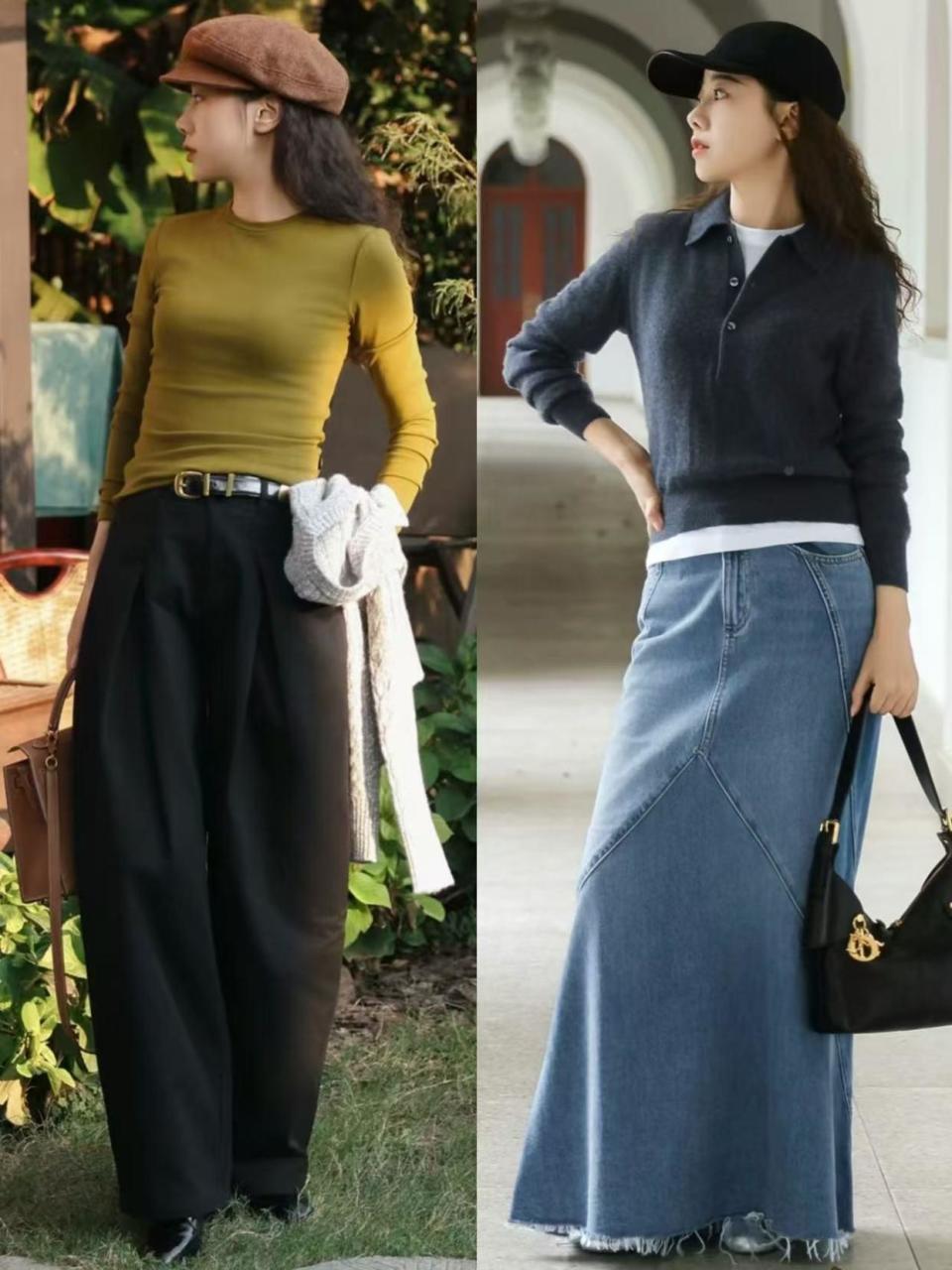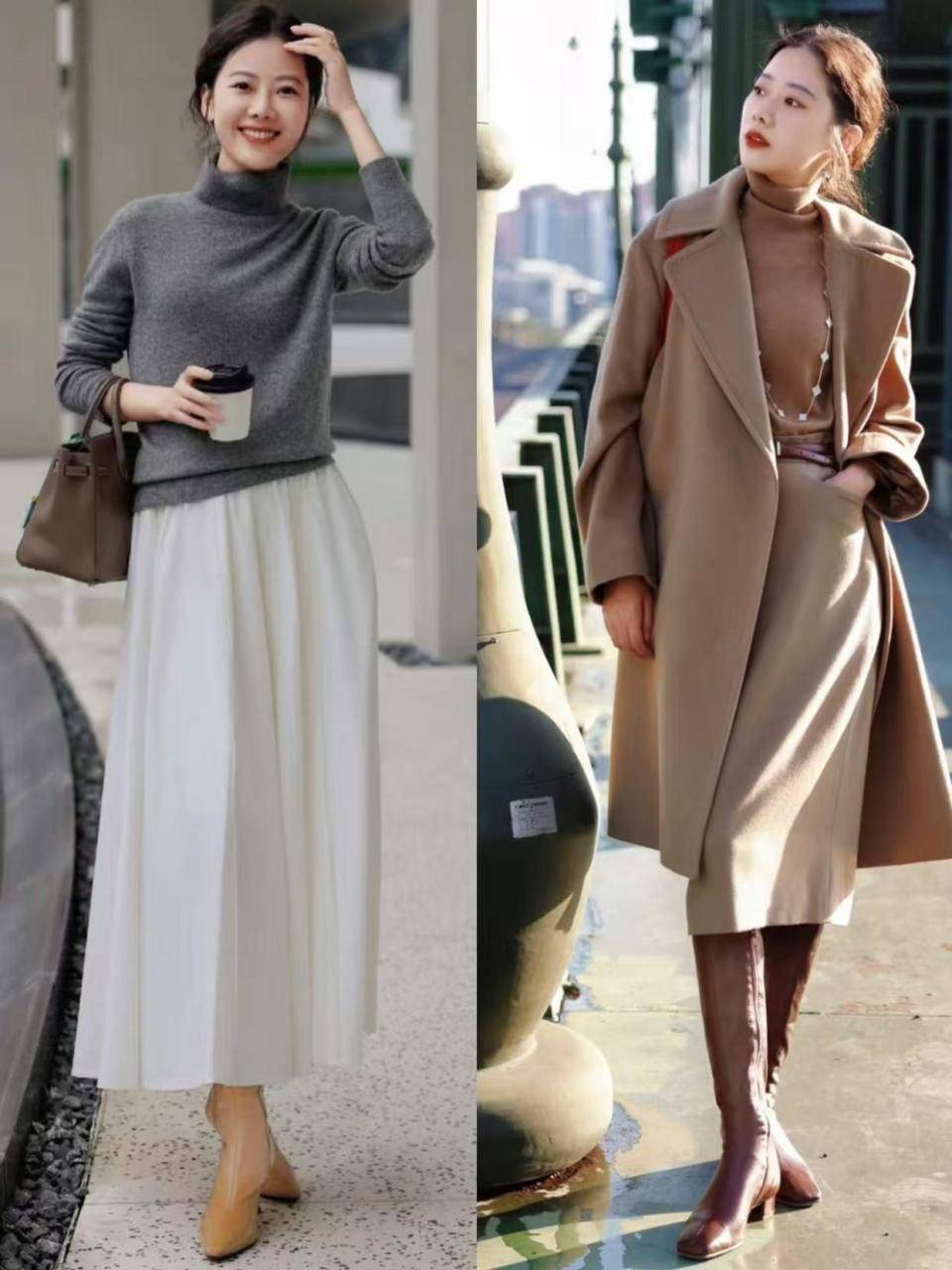 有的时候我们也想让自己变得更加优雅,有女人味,少不了的就是一条裙子,如上面这一条压褶的伞状半身裙和卡其色的直筒半身裙,搭配上了半高领的毛衣,瞬间使得造型变得温柔得体又大方。