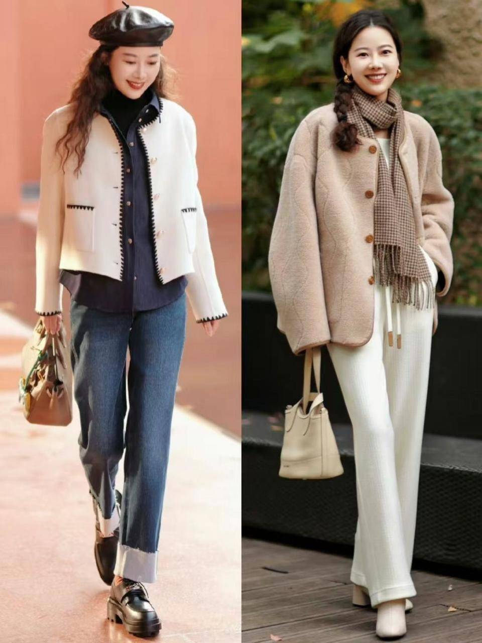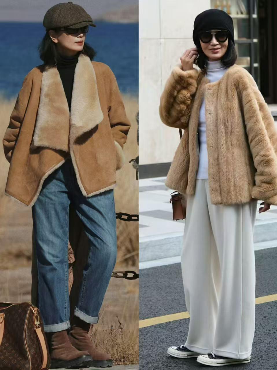 作为中年女性,我们直接选择像上面这样的牛仔直筒裤或者是白色的阔腿裤来搭配上毛绒外套,就能呈现出非常有高级感的造型。