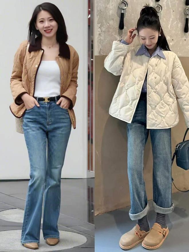白色的棉服外套搭配上牛仔阔腿裤,这样的穿搭非常符合梨形身材的女生,且采用的还是上短下长的搭配方式,能够使得穿搭者的身材形成三七分。
