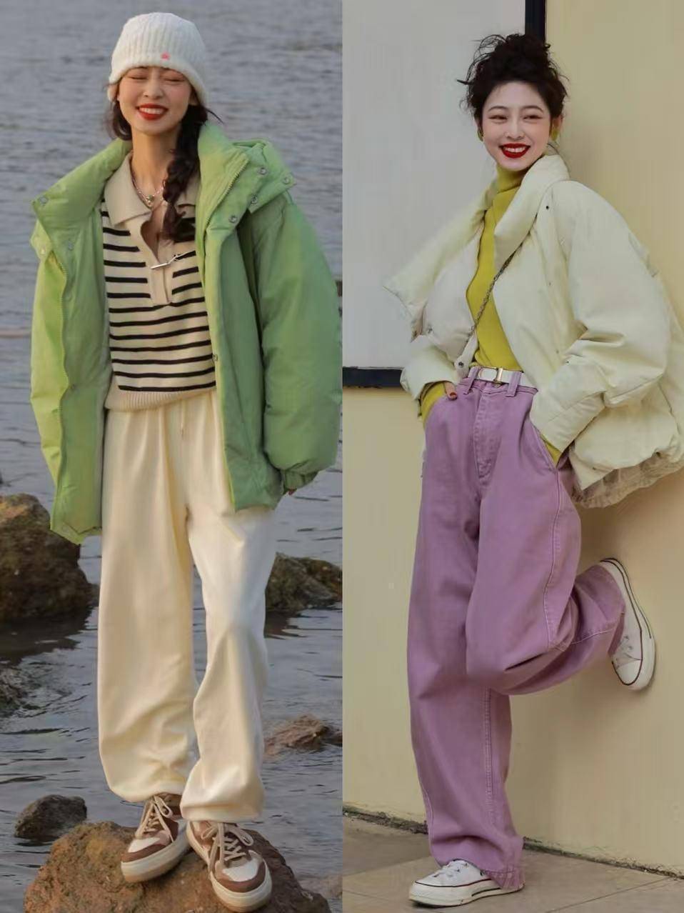 年轻貌美的你,甚至还可以选择浅绿色的羽绒服,内搭黑白条纹的针织衫和一条新色的休闲长裤,脚上穿的一双小板鞋,这样的搭配比较适合年轻貌美的你,这样会更个性。