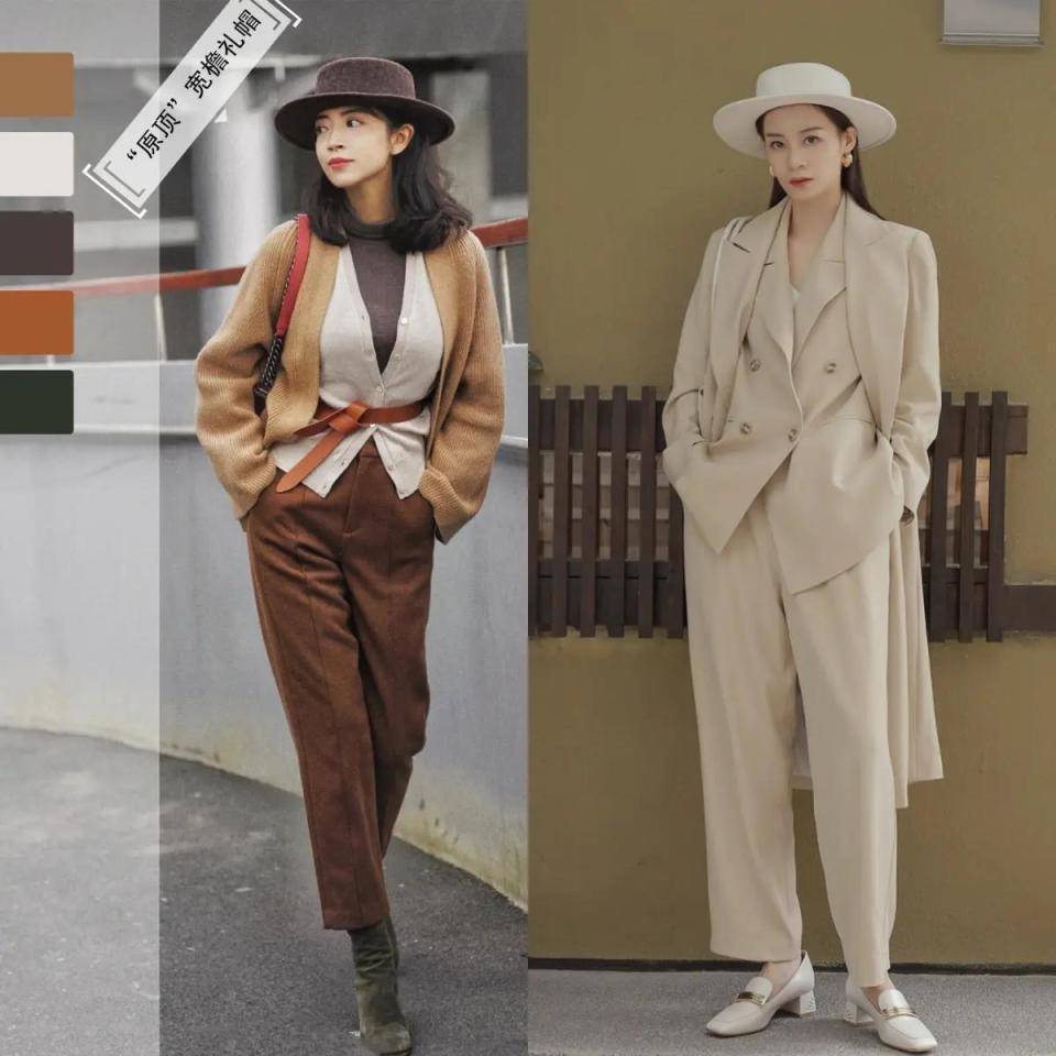在这寒冷的冬天,真的非常适合用叠加的穿搭方法,能让你的造型更有层次感,比如“三木”时尚博主选择了一件驼色的针织开衫,内搭白色的针织开衫,外面直接叠加一件灰色的毛衣,下半身是一条驼色的9分西装裤脚穿短靴,头上戴了一顶宽檐帽,就能让造型氛围感直接拉满,而且为了能使得自己的身材比例变得更协调,还在腰间勒上一款棕色的腰带,形成”高腰线”。