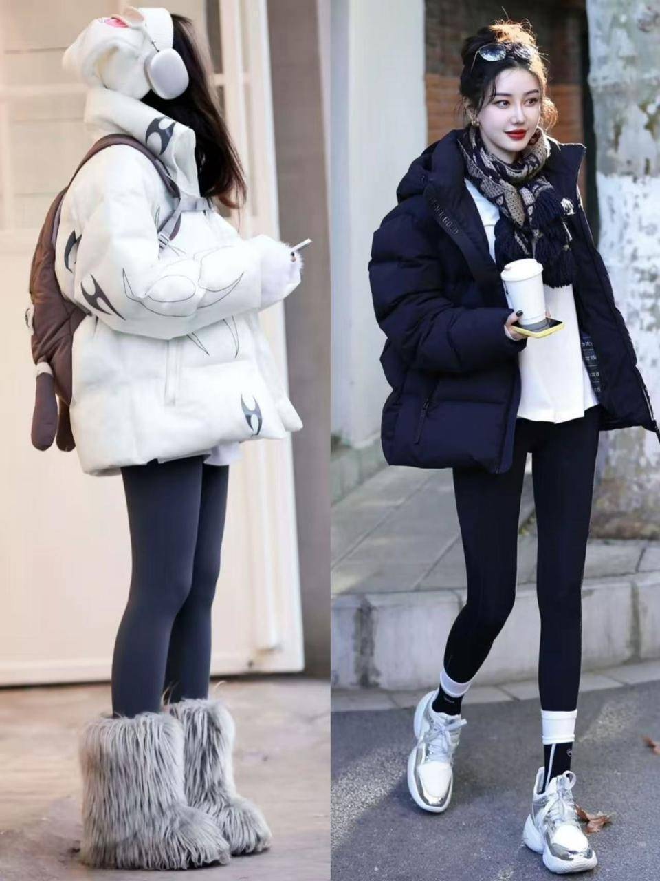 今年还流行另一种新穿法,用羽绒服搭配上无痕裤脚,穿一双雪地靴,这样的造型能更好的呈现出你的美腿,抢眼又抢镜。
