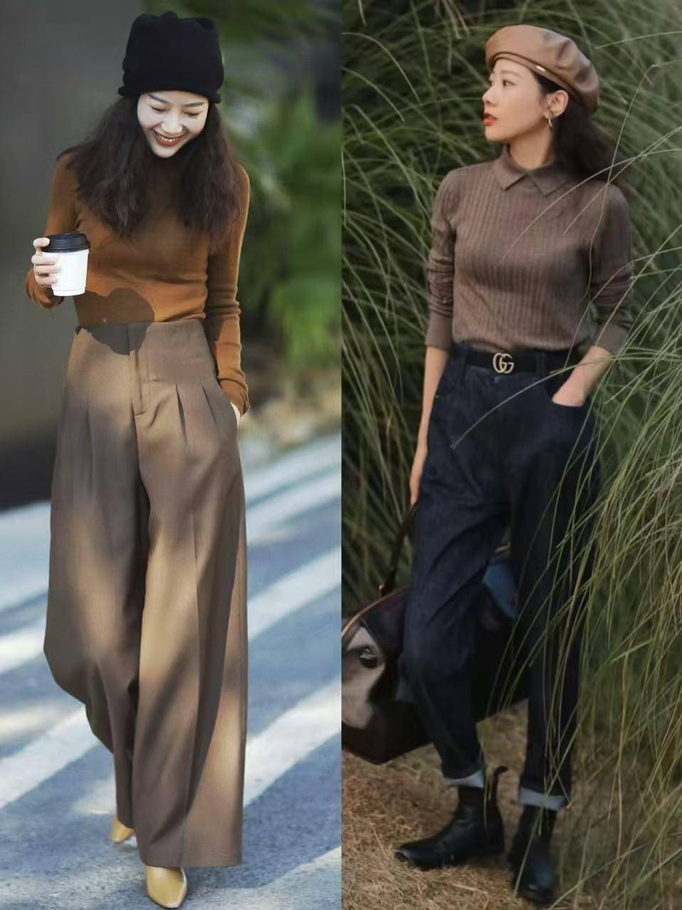 其实现在虽然气温骤降,但在白天的时候出太阳,温度还算暖和的,只是温差稍微大一点,早上和晚上需要加上一件外套才能感受到温暖,白天的时候你可以直接选择一件针织毛衣搭配上阔腿裤或者是烟管裤,这样非常符合职场女性的穿搭,简约干练,通勤时髦。