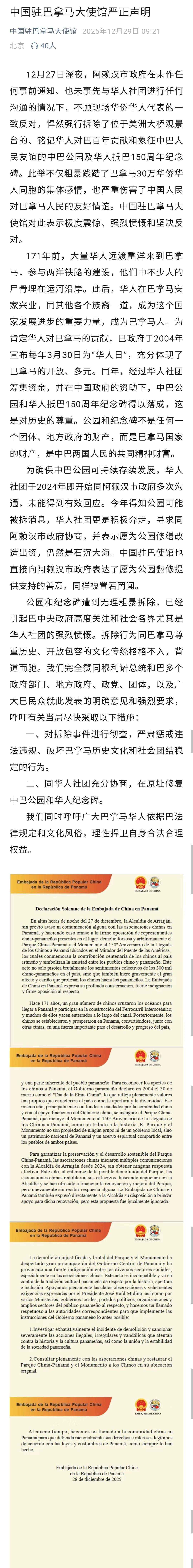 北京时间29日上午,中国驻巴拿马大使馆官微发布严正声明表示,12月27日深夜,阿赖汉市政府在未作任何事前通知,也未事先与华人社团进行任何沟通的情况下,不顾现场华侨华人代表的一致反对,悍然强行拆除了位于美洲大桥观景台的、铭记华人对巴百年贡献和象征中巴人民友谊的中巴公园及华人抵巴150周年纪念碑。此举不仅粗暴践踏了巴拿马30万华侨华人同胞的集体感情,也严重伤害了中国人民对巴拿马人民的友好情谊。中国驻巴拿马大使馆对此表示极度震惊、强烈愤慨和坚决反对……