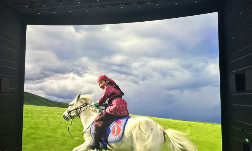 据倪闽景介绍,这块屏幕集成了4K、3D、高亮度、高帧率等七大顶尖技术。“这次我们采用了中国自主研发、全球领先的LED技术。这是目前全球最大、也是最薄的LED巨幕,屏幕厚度仅2毫米,透声率却是最高的。”据了解,这块屏支持120帧高帧率放映,对比度极高,能让观众纤毫毕现地观察到赛马的肌肉律动。