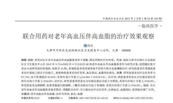 参考资料:郑鸿达.联合用药对老年高血压伴高血脂的治疗效果观察,中国城乡企业卫生,2022-2