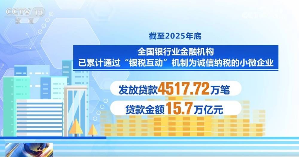 据了解,截至2025年底,全国银行业金融机构已累计通过“银税互动”机制为诚信纳税的小微企业发放贷款4517.72万笔、贷款金额15.7万亿元。