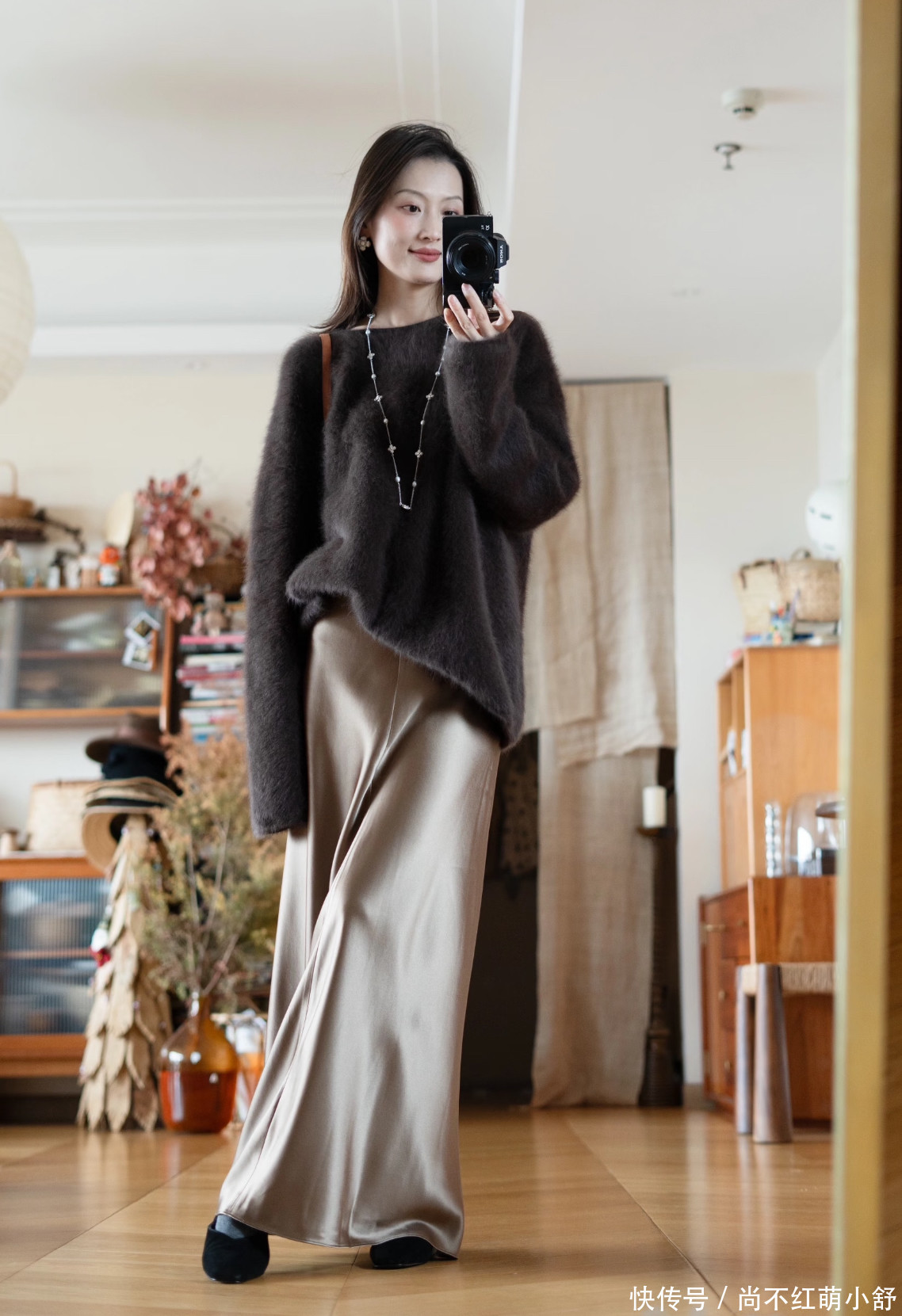 穿搭示范1:一条银灰色缎面中长裙,搭配一件宽松的灰色毛衣,脚上穿一双平底鞋。这种“上下风格反差”正是时髦精最爱的套路,毫不费力就赢了。